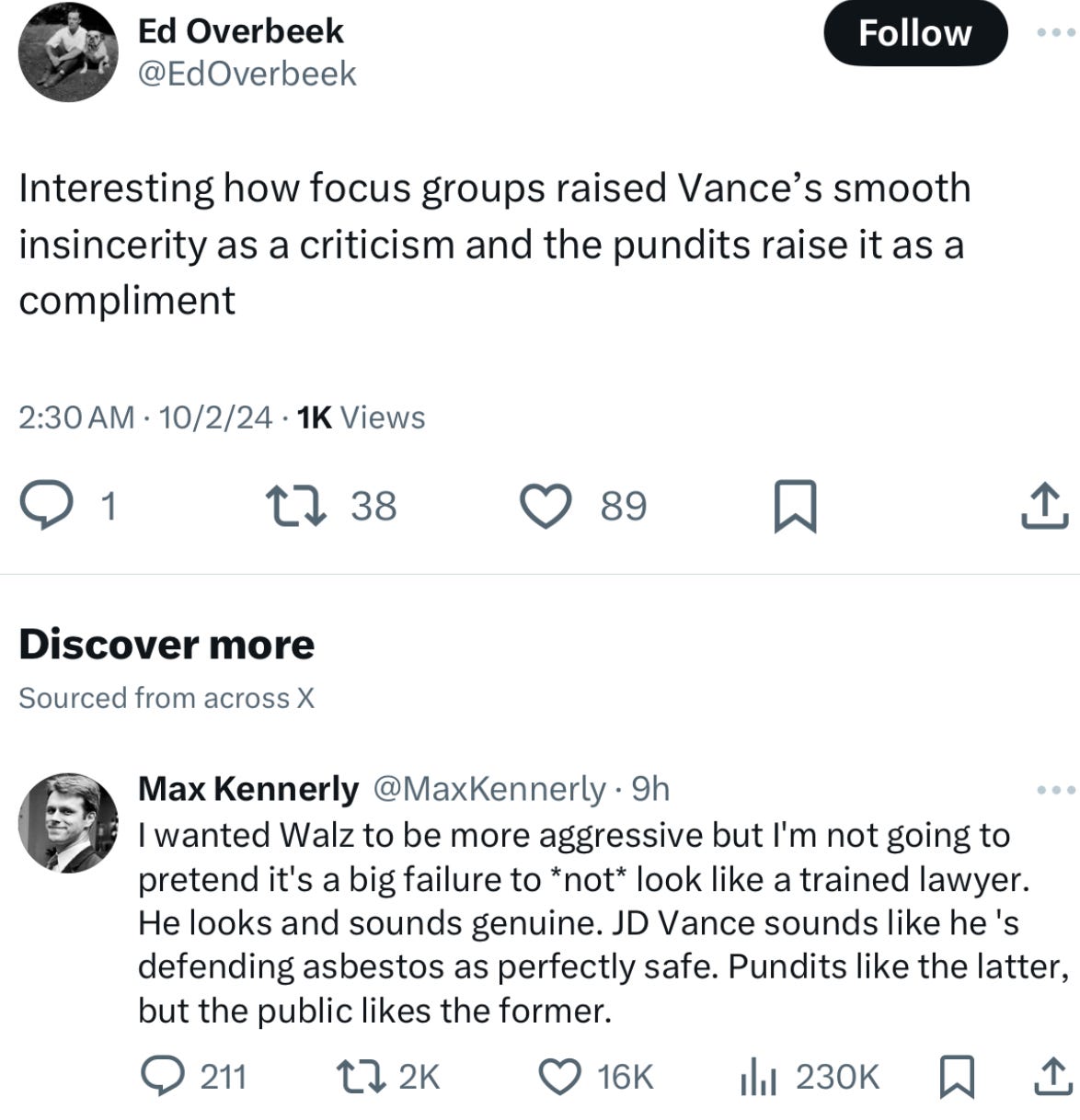 Many people in the discussion talked about how he just looked confident and smooth…well a polished lie is still a lie and I’d venture to say its even worse. JD speaks as someone unburdened by the constraints of the truth and tethered far from reality. The guy who feigned compassion and agreement with Walz when it might be a poll bump was not the same guy who used his Twitter fingers to call out Trump and attack women. He was putting on a show and some people fell for it.