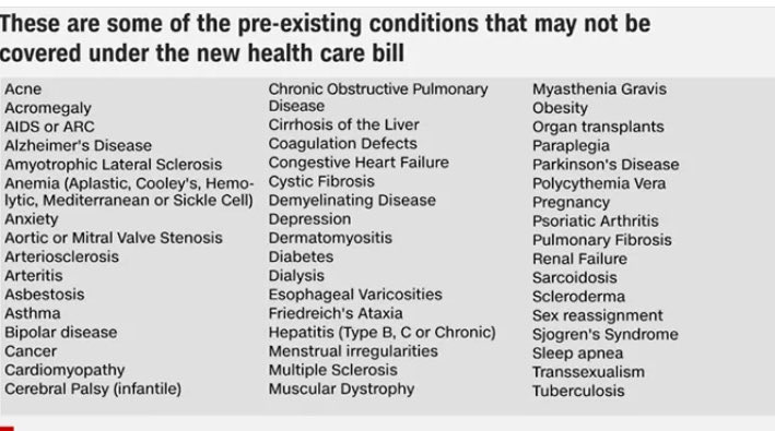 He then said they wanted to improve Obamacare because they have a better, dare I say, concept of a plan, and WOULD protect pre-existing conditions. But that is another smooth lie… the proposed Trump plan has a LONG list of not covered pre-existing conditions.: