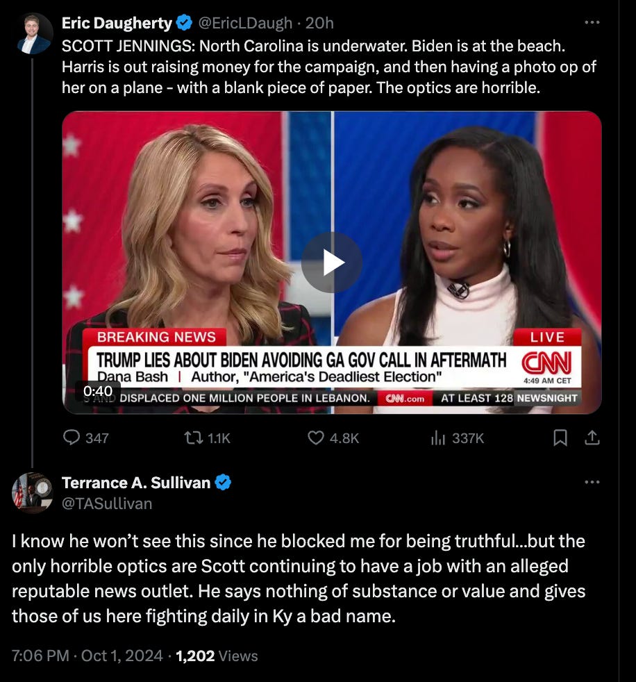 Policy has been lost in our country and been given the backseat to politics. I had a moment before the debate while working out that caused me to stop and rant on the actual Twitter (not ever making X happen) about some comments on CNN made by a fellow Louisville resident, who has been on THREE boards with me and did one SIX MONTH project with me and still acts like he doesn’t know me when it is convenient, Scott Jennings. Scott was waxing poetic about the hurricane and the optics of President Biden and Vice President Harris not doing a stunt to get attention in the devastated areas. (Btdubbs click here to find where you can donate to disaster relief)
