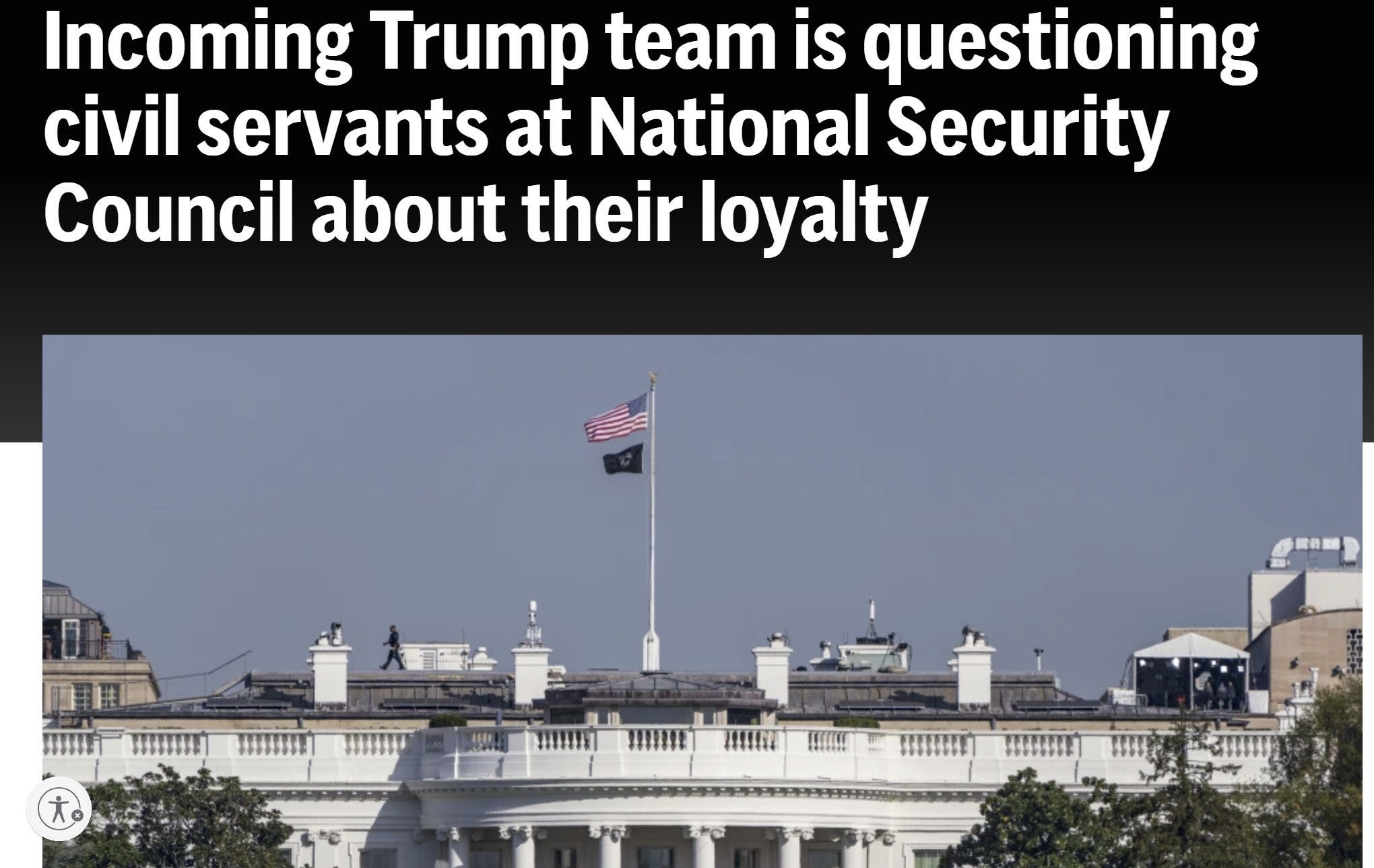 But I was thinking about TWW when I saw the super good news that the incoming Cheeto-Skin-in-Chief and his team were beginning to question civil servants about their allegiance to Dorito Dude.