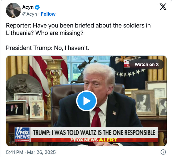 In other stupid news that sounds fake but isn’t, the literal President of the USA claimed to know NOTHING about the signal chat debacle AND he claimed to know nothing about some American soldiers missing that same day.