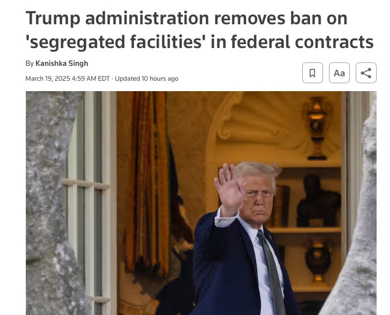 You read that right. Segregation is cool again. Granted, we have been segregated by policies for decades, but to strike the ban on federal contracts is a very loud signal to the most racist AND SEXIST among us.