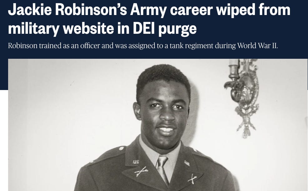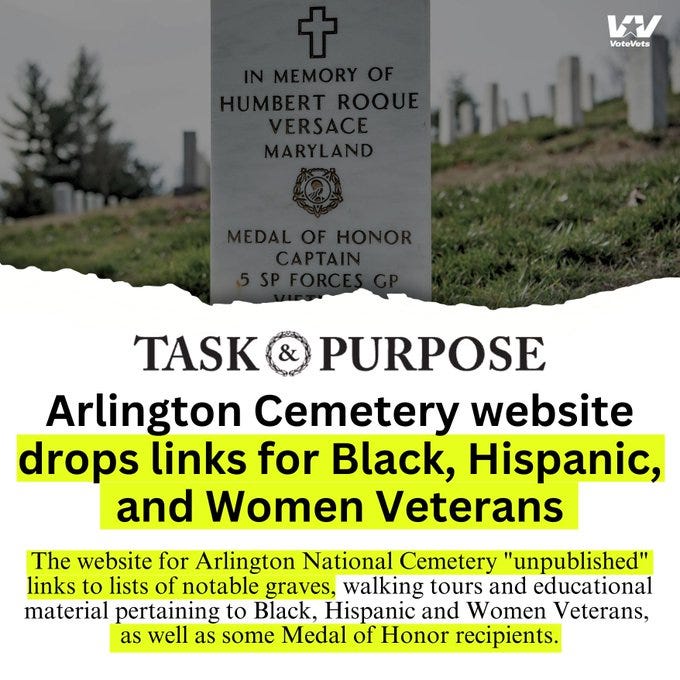 The website for Arlington cemetery, the largest national cemetery and one of two maintained by the US Army (where Jackie Robinson served) in the country, has dropped the links for references to any Black, hispanic, and women veterans.