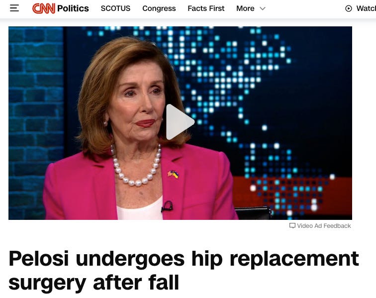 And not to be outdone, former speaker and Democratic Leader, Nancy Pelosi, also fell this week and needed to have emergency hip replacement surgery.