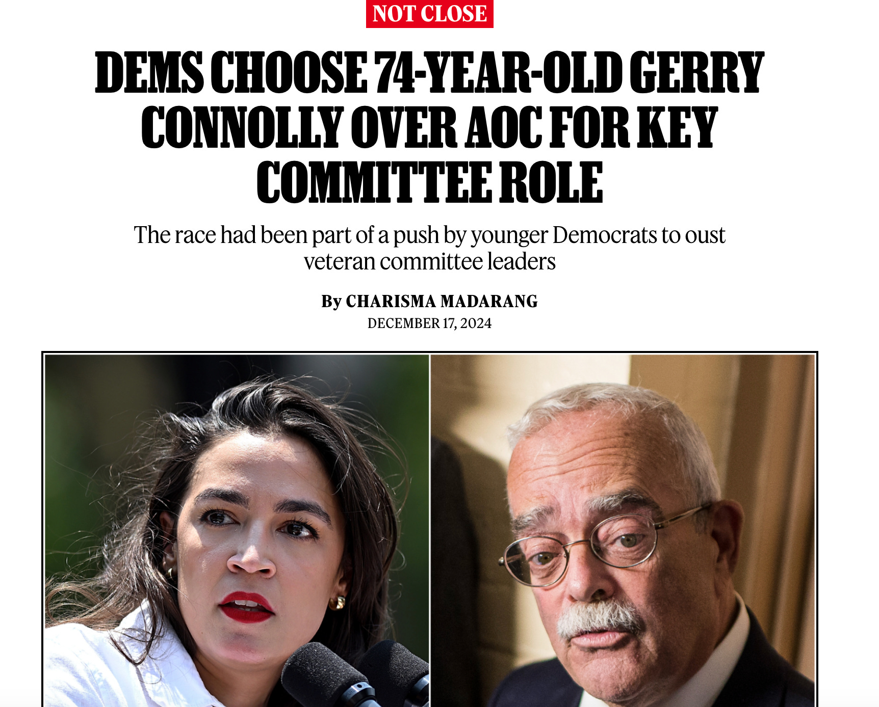 Of course this thought is in reference to the news today that Alexandria Ocasio-Cortez, one of the few Dem members of Congress who seems to care about more than just having the title, lost out to 74 year old Gerry Connolly (who?) for the coveted role as ranking member of the oversight committee.