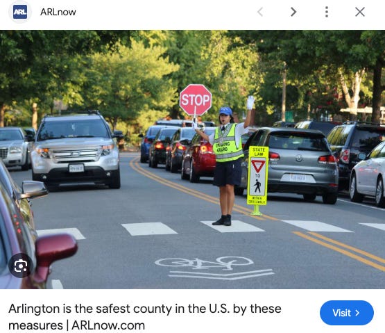 So glad she had that flak jacket on. Those crossing guards look MEAN.
