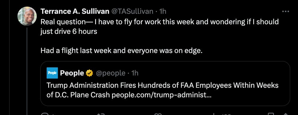 For those of us in the real world, I’m scared. I had my first flight during this administration last week…and nerves were bad. Not just me. It was clear many more people were more on alert than normal. And this is coming from someone who previously flew 2-3x a week for work. Ya boy had miles.