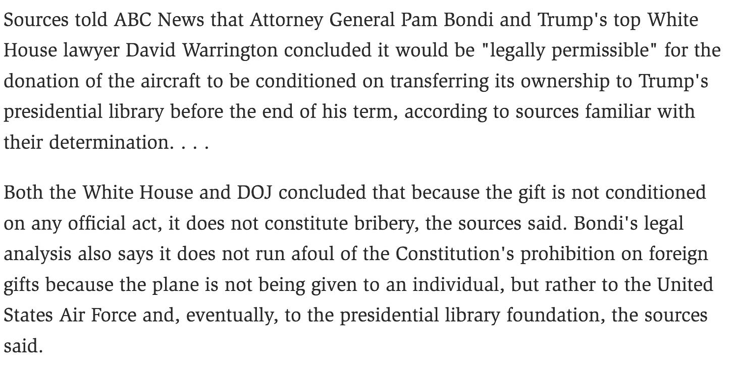 And while we are talking about foreign influence…um how do you ensure security in a giant flying thingy that was ‘gifted’ by a foreign government. I recently got a used car off a guy from Craigslist and while he was really cool (and ironically a pilot) idk WHAT that car has been through in the past and I don’t think there is an independent Carfax for government planes.